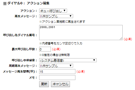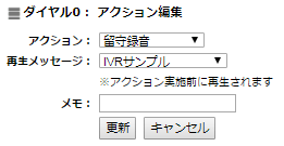 選択できるアクションは、「何もしない」、「メッセージ再生」、「留守録音」、「キュー呼び出し」、「ダイヤル」の5つです。