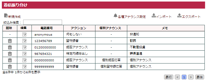 | 1 | 電話番号 | 着信振り分けとして扱う電話番号