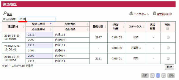 「発信元番号」「発信者名」「着信先番号」「着信者名」のうち、絞込み検索入力エリアに入力されたワードが含まれるデータを抽出して表示します。 入力エリアに文字を入力する毎に絞込みを行い、抽出されたデータの表示を行います。