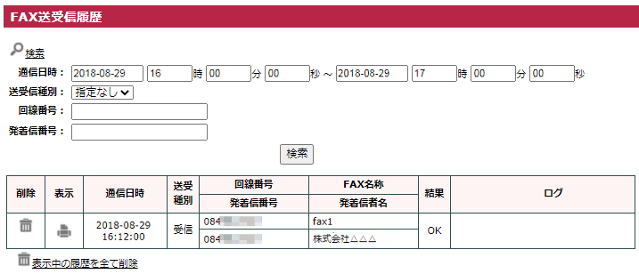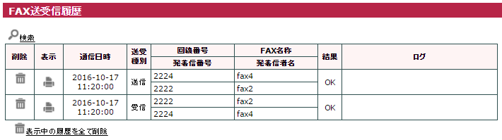 管理者ログイン時は、全てのFAX送受信履歴が表示されます。
