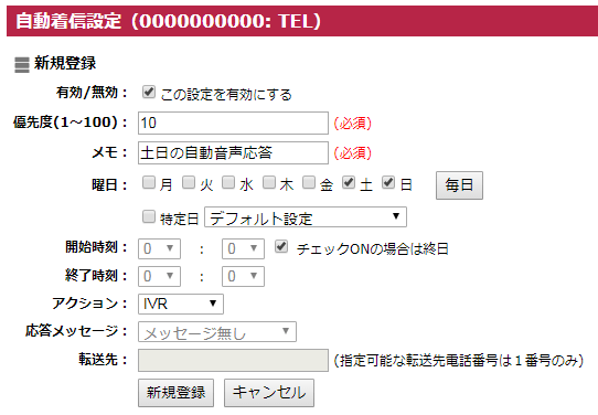 土曜日、日曜日に外線着信した場合、3秒後にIVR処理(自動音声応答) が開始されます。