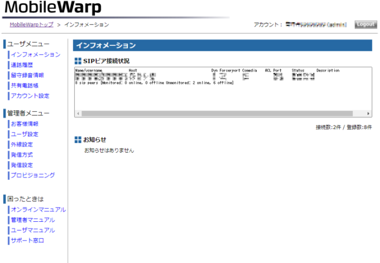 メニューを選択することで、MobileWarp管理画面の表示を行います。